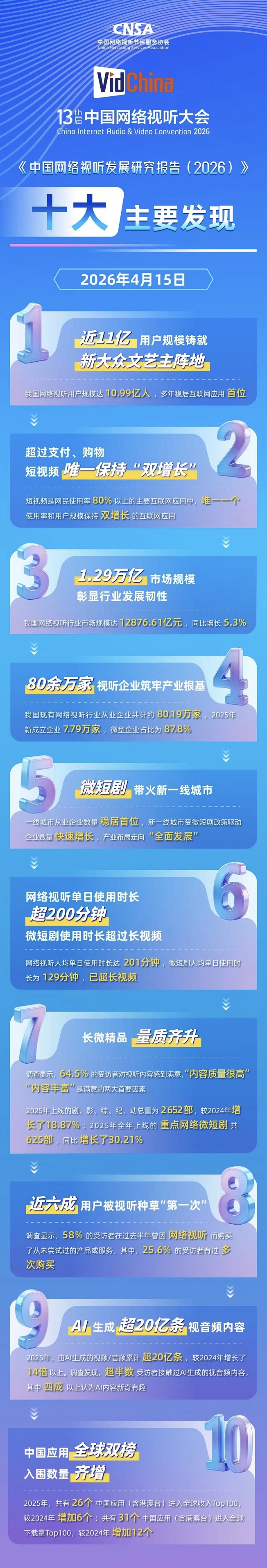 2026年4月15日,第十三届中国网络视听大会在四川成都开幕,中国网络视听协会现场发布《中国网络视听发展研究报告(2026)》核心成果。报告全面呈现我国网络视听行业发展最新格局:行业用户规模逼近11亿,持续位居互联网应用首位;市场规模突破1.28万亿元,产业韧性显著增强。行业在用户增长、内容供给、技术创新、消费带动与全球化布局等方面亮点突出,已成为我国数字大众文艺主阵地与数字经济重要支撑。